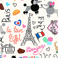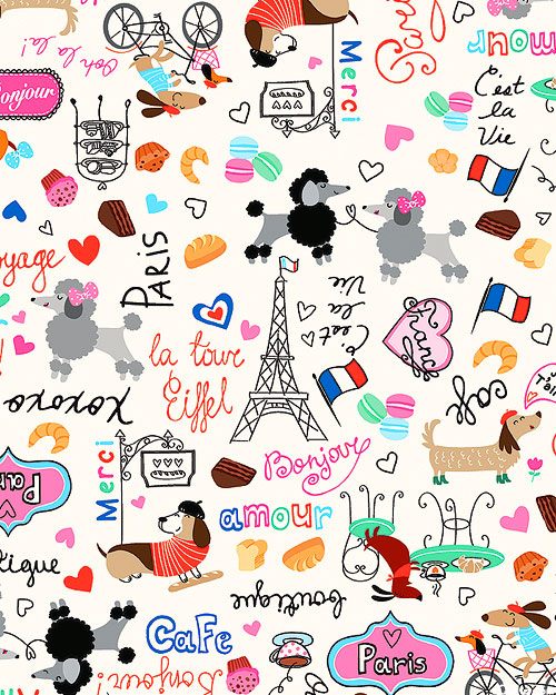Charming canines enjoy the French atmosphere of a Parisian plaza as the Eiffel tower and various French motifs and words are scattered across the design. Eiffel Tower is about 3-1/4", 'Parisian Pups Words' from the 'Parisian Pups' collection by Kanvas Studio for Benartex Fabrics.