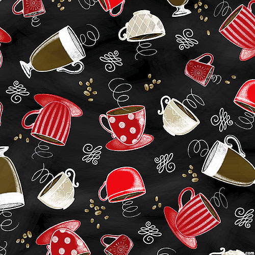 Mugs filled with freshly brewed coffee are scattered across the design with swirly flourishes and coffee beans scattered in the space between. Larger coffee cups are about 2", 'Perfect Brew Cups' from the 'Perfect Brew' collection by Andi Metz for Benartex Fabrics.