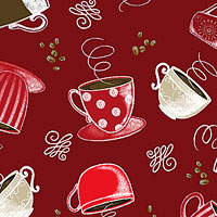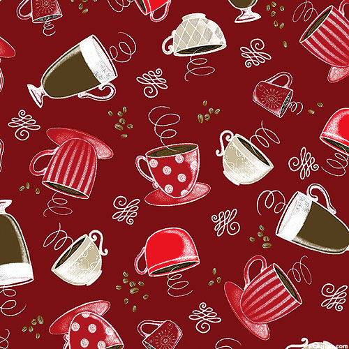 Mugs filled with freshly brewed coffee are scattered across the design with swirly flourishes and coffee beans scattered in the space between. Larger coffee cups are about 2", 'Perfect Brew Cups' from the 'Perfect Brew' collection by Andi Metz for Benartex Fabrics.