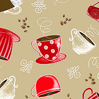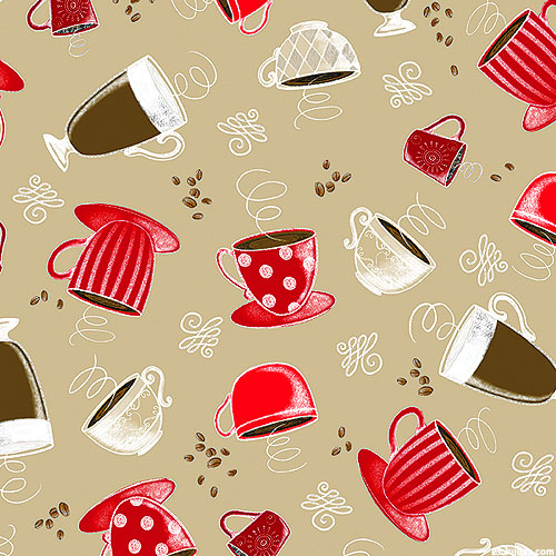 Mugs filled with freshly brewed coffee are scattered across the design with swirly flourishes and coffee beans scattered in the space between. Larger coffee cups are about 2", 'Perfect Brew Cups' from the 'Perfect Brew' collection by Andi Metz for Benartex Fabrics.
