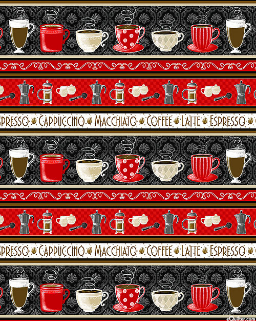 Names of various coffee drinks are written between the layers of this coffee-lovers stripe with mugs of coffee and other coffee-themed tools depicted in the space between. Wider stripes are about 4", stripes run the length of the fabric, 'Perfect Brew Stripe' from the 'Perfect Brew' collection by Andi Metz for Benartex Fabrics.