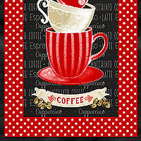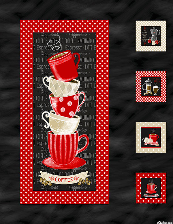 Panel blocks contain slogans related to the love of coffee and various coffee brewing implements including moka pots, french presses, and a stack of mugs piled high! 35" panel, 'Perfect Brew Panel' from the 'Perfect Brew' collection by Andi Metz for Benartex Fabrics.