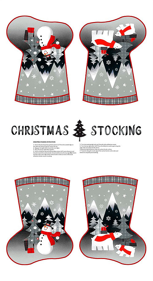 This project panel features a merry mix of Christmas stockings containing imagery of snowmen, polar bears, and a snowy winter forest. 24" panel, from the 'Red & Grey Christmas' collection by Paintbrush Studio for Fabri-Quilt.