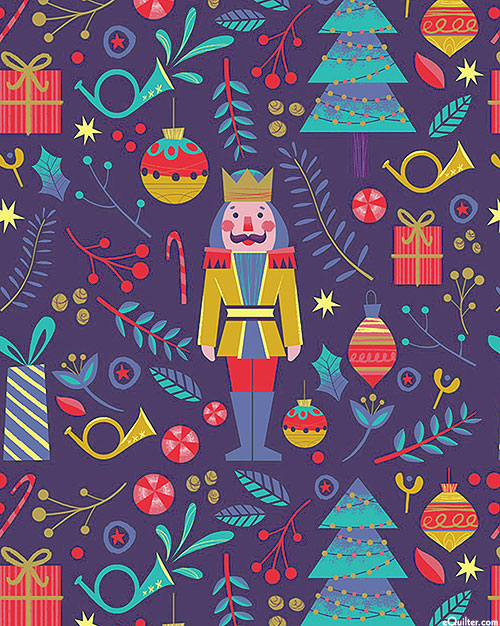 Nutcracker dolls are seen amidst a festive toss of Christmas trees, holly sprigs, and other ornaments. Nutcrackers are about 7" tall, with gold metallic, from the 'Night Of The Nutcracker' collection by Paintbrush Studio for Fabri-Quilt.
