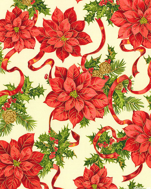 Larger poinsettias are about 6-1/4", with gold metallic, from the 'Holiday Edition' collection by Paintbrush Studio for Fabri-Quilt.