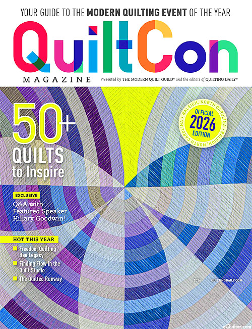 Your 2026 guide to the QuiltCon experience! Take a sneak peak at more than 50 quilts, including 15 quilts selected from the show and a glimpse at the Special Exhibit Gallery. Feature articles on Hillary Goodwin - Quiltcon 2026 Featured Speaker; Special Exhibits - including Freedom Quilting bee Legacy, Medallion Quilts, and more quilts by Hillary Goodwin; QuiltCon Style Watch; article about Stitching for Calm; Color Stories of Modern Quilts; The Quilted Runway - Modern Quilting meets Fashion. Included you will find 7 special quilt patterns from Modern quilting's best: Birds in Flight from Morning ‘Til Night by Carla Resnik, Form Follows Fashion by Tara Glastonbury, Lavender Marmalade by Patty Dudek, Pick-A-Path by Kathy Greer, Wisteria by Debora Rivera, Mesmerist by Jo Westfoot, Zaragoza by Cecilia Ruhl. 'QuiltCon' magazine - 2026.