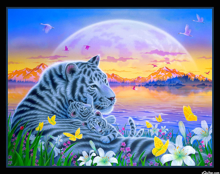 A mother white tiger and her two adorable cubs cuddle together as a dazzling sunset colors the landscape in a vibrant variety of vivid hues in this picturesque panel. 36" panel, from the 'Under The Moon' collection by Kentaro Nishino for Elizabeth's Studio.