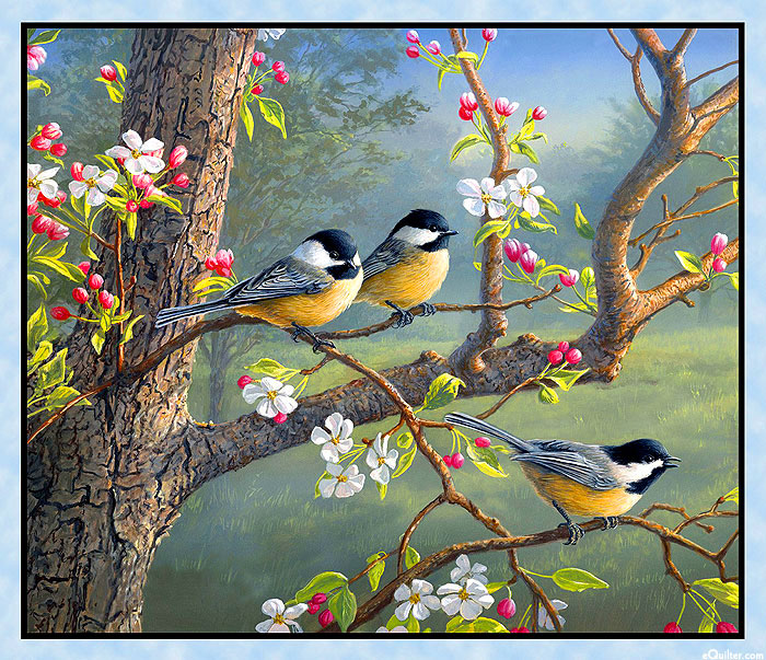 Three adorable chickadee birds are seen perched on a thin tree branch that is accented with a colorful burst of lush florals in this picturesque panel. 36" panel, from the 'Chickadee Morning' collection by James Hautman for Elizabeth's Studio.