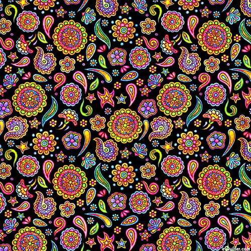 Flowery shapes and curling paisleys are scattered against a solid background in an energetic expression of color. Digitally printed, 36" panel, larger flowers are about 1", from the 'Skullduggery' collection by Dan Morris for Quilting Treasures.