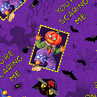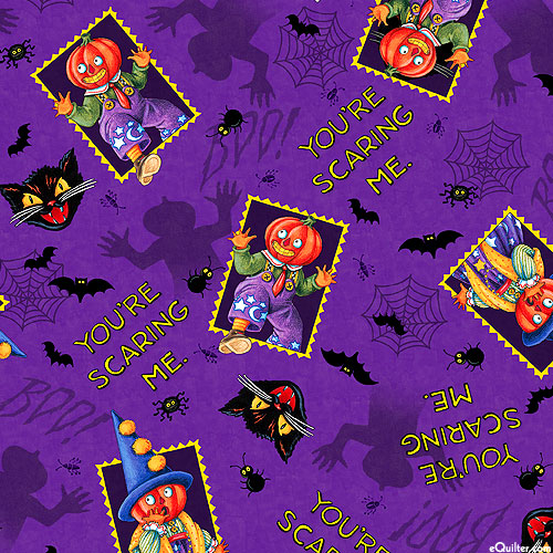Halloween-themed stamps with pumpkin-headed creatures are scattered against a background of spooky spiderwebs, black cats, and fluttering bats in this fun and festive design. Larger frames are about 1-3/4", 'You're Scaring Me' from the 'Spooky Cute Halloween' collection by Mary Engelbreit for Free Spirit.