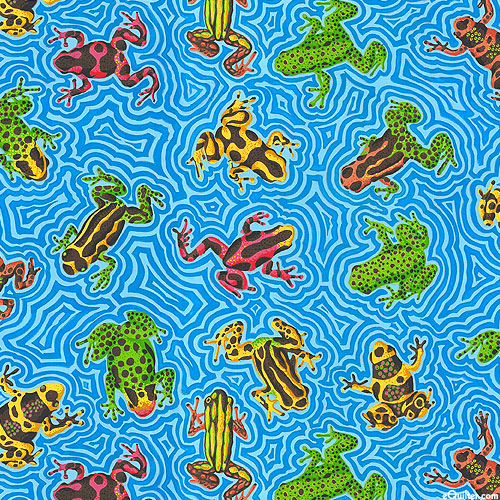 Colorful tree frogs hop to and fro against a rippling pond background. Larger frogs are about 1-3/4", 'Froggies' from the 'Utopia' collection by Philip Jacobs of Snow Leopard Designs for Free Spirit.