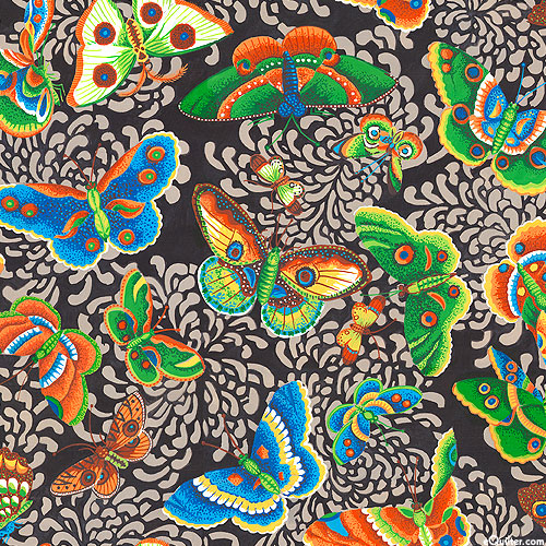 Dreamy butterflies flutter freely among a lush background full of flowery shapes. Larger butterflies are about 2-1/2", 'Chrysanthemum Butterfly' from the 'Utopia' collection by Philip Jacobs of Snow Leopard Designs for Free Spirit.