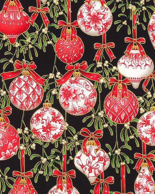 Elegant Christmas ornaments are strewn across this fun and festive design. Larger ornaments are about 2", with gold metallic, from the 'Holiday Flourish - Festive Finery' collection by Studio RK for Robert Kaufman Fabrics.