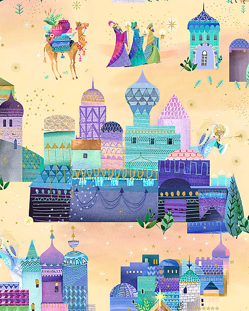 Eclectic depictions of middle eastern cities make way for angels, wise men, and camels bearing gifts for the little baby Jesus as they make their way towards Bethlehem. Churches are about 3", with gold metallic, from the 'Holy Night' collection by Lynn Horrabin for Robert Kaufman Fabrics.