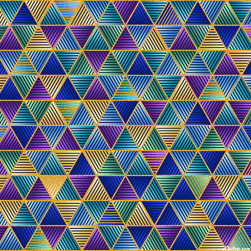 Marvel in admiration at the exquisite elegance evoked by this stunning geometric design from a bygone era - the wealth of fine detail and vividly rich colors lending an ancient allure to this fabulous fabric. Triangles are about 1/2", with gold metallic, from the 'Ancient Beauty' collection by Studio RK for Robert Kaufman Fabrics.