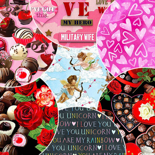 A romantic assortment of delectable chocolates, tender hearts, and other Valentines motifs are sure to add a lovely flair to your next project! Fabrics may vary from image shown.