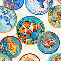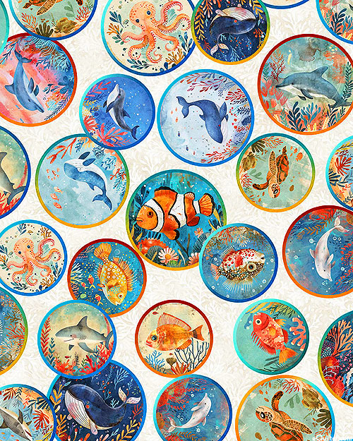 All the creatures of the sea are gathered together in harmony including whales, sharks, stingrays, dolphins, turtles, and octopi. Digitally printed, larger circles are about 3", from the 'Deep Sea Dazzle' collection by Dan Morris for Quilting Treasures.