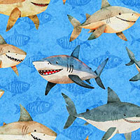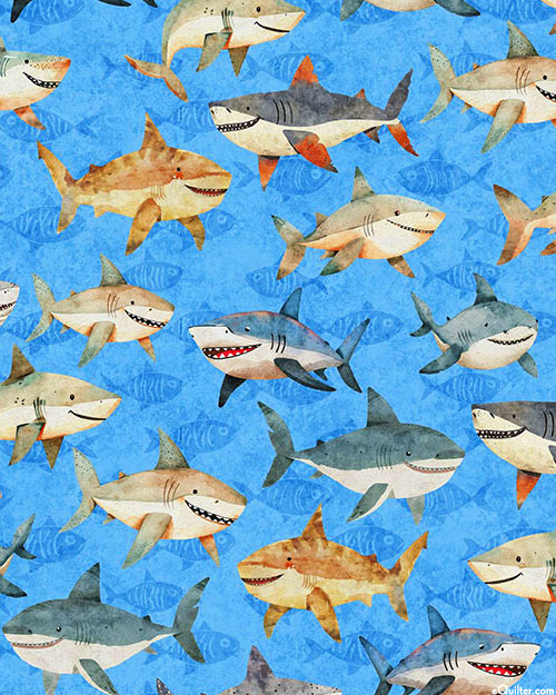 A friendly congregation of happy sharks flash toothy grins as they swim through the ocean together. Digitally printed, larger sharks are about 3", from the 'Deep Sea Dazzle' collection by Dan Morris for Quilting Treasures.