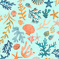 Starfish, kelp, and bits of coral are scattered about, lending an aquatic allure to this charming print. Digitally printed, larger seashells are about 1", from the 'Deep Sea Dazzle' collection by Dan Morris for Quilting Treasures.