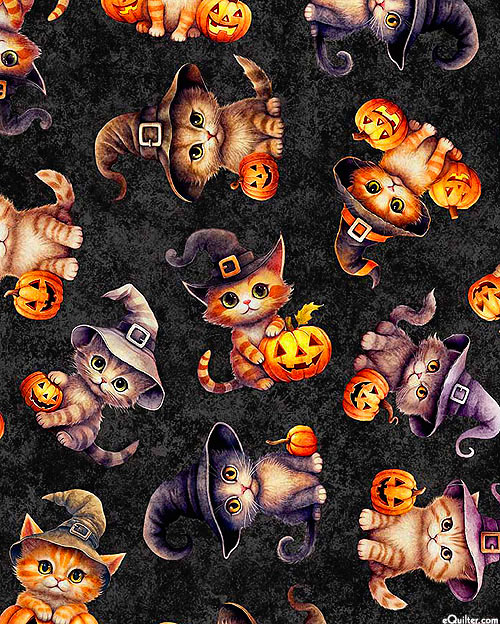 Cute kitties wearing witch hats are posed next to freshly carved jack o' lanterns in this fun and festive Halloween-themed design. Digitally printed, larger cats are about 3-3/4", from the 'QT Cuties' collection by Dan Morris for Quilting Treasures.