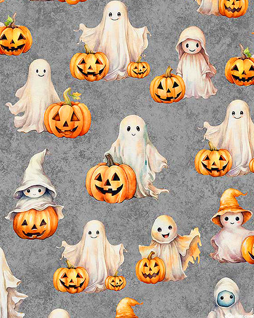 Cute little ghosts haunting a pumpkin patch full of freshly carved jack o' lanterns lend a spooky flair to this Halloween-themed print. Digitally printed, larger ghosts are about 2-1/2", from the 'QT Cuties' collection by Dan Morris for Quilting Treasures.