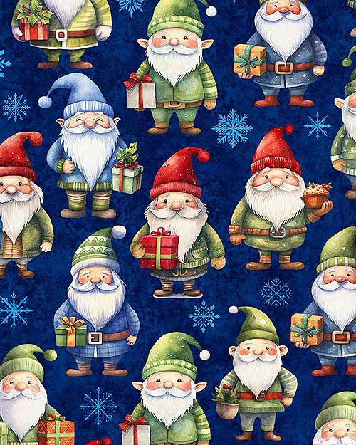 Bearded gnomes pass gifts to one another in this fun and festive Christmas-themed design. Digitally printed, larger gnomes are about 3-3/4", from the 'QT Cuties' collection by Dan Morris for Quilting Treasures.