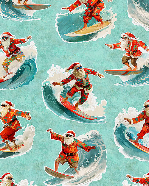 Relaxing on vacation in the tropics is a very merry St. Nick seen surfing tropical islands in this fun and festive design. Digitally printed, larger surfing Santas are about 4", from the 'Gotta Have It' collection by Dan Morris for Quilting Treasures.