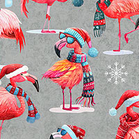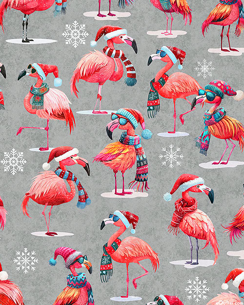 Flamingos relax in style as they wear a festive assortment of cozy scarves and cool glasses in this whimsical Christmas-themed design. Digitally printed, larger flamingos are about 3-1/2", from the 'Gotta Have It' collection by Dan Morris for Quilting Treasures.