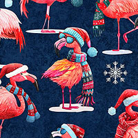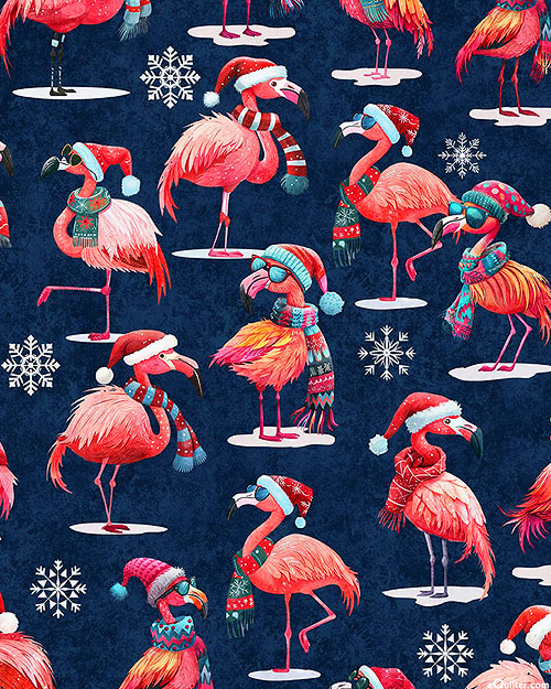 Flamingos relax in style as they wear a festive assortment of cozy scarves and cool glasses in this whimsical Christmas-themed design. Digitally printed, larger flamingos are about 3-1/2", from the 'Gotta Have It' collection by Dan Morris for Quilting Treasures.