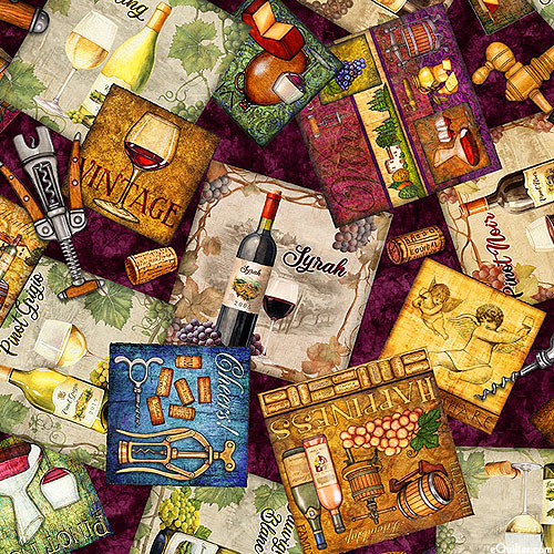 A collection of wine motifs are depicted in scattered squares across the design including wine bottles, glasses, and corkscrews. Digitally printed, larger frames are about 3-1/4", from the 'Cork & Barrel' collection by Dan Morris for Quilting Treasures.