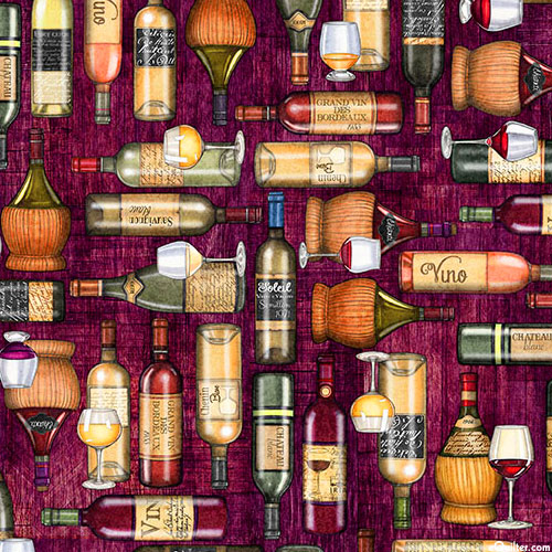 Various glasses and bottles of fine wine are scattered across a a mottled background. Digitally printed, larger wine bottles are about 2", from the 'Cork & Barrel' collection by Dan Morris for Quilting Treasures.