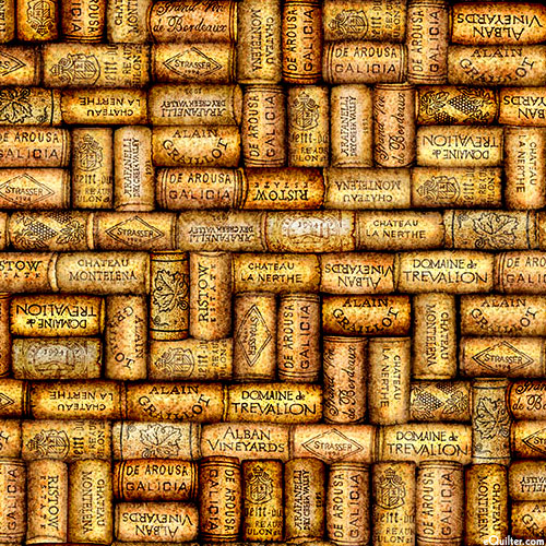 An assortment of wine corks are neatly stacked together across the design. Digitally printed, larger corks are about 1-1/4", from the 'Cork & Barrel' collection by Dan Morris for Quilting Treasures.