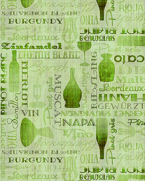 Names of fine wines are written across the design with accompanying motifs including wine glasses, bottles, and corkscrews. Digitally printed, larger bottles are about 2-1/2", from the 'Cork & Barrel' collection by Dan Morris for Quilting Treasures.