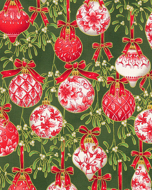 Elegant Christmas ornaments are strewn across this fun and festive design. Larger ornaments are about 2", with gold metallic, from the 'Holiday Flourish - Festive Finery' collection by Studio RK for Robert Kaufman Fabrics.