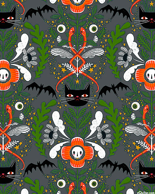 Snakes, bats, and cats weave together into spooky totems decorated in eyeballs and flowers across this fun and festive Halloween-themed design. Larger cats are about 2", 'Cat Tower' from the 'Witchy Ways' collection by Cori Dantini for Free Spirit.