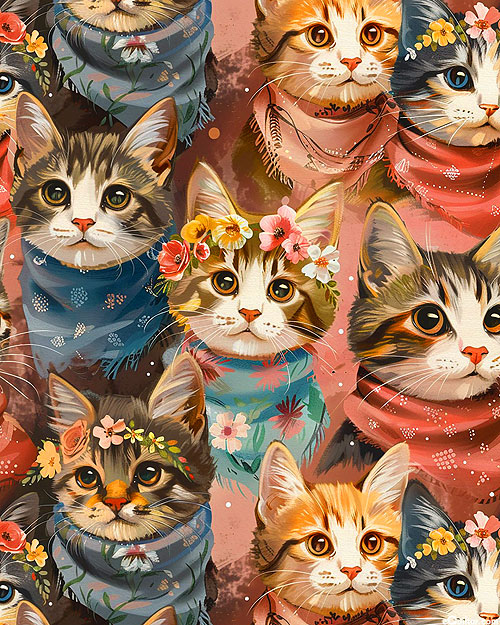 An adorable cast of kitties are dressed up in flowery crowns and elegant scarves in this cute and cuddly print. Digitally printed, larger cats are about 5", 'Dress Up Cats' by David Textiles.