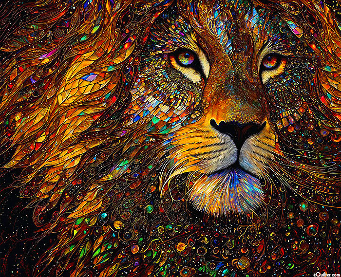 Emerging from a mosaic of glass-like tiles is a majestic lion proudly posed in a vibrant variety of vivid hues across this picturesque panel. 37" panel, 'Majestic Lion Panel' from the 'Gilded' collection by Peggy Collins for Camelot Fabrics.