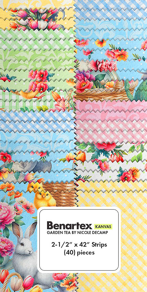'Garden Tea' collection strip pack by Nicole DeCamp for Benartex, pack includes forty 2-1/2" x 42" strips.