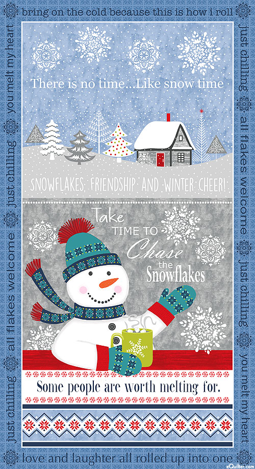 In this charming pane, a small cabin sits alone in the middle of a blizzard, and a snowman waves while holding on to a steaming cup of hot chocolate. Snow phrases and snowflakes can be found all over. 24" panel, panel has one frame about 19-3/4" x 16-3/4" and one frame about 19-3/4" x 19", with pearlescent, from the 'Nordic Cabin' collection by Cherry Guidry for Benartex Fabrics.