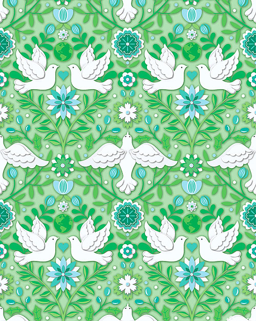 Doves are framed elegantly by verdant leaves growing symmetrically in this one way print. Stylized winter florals, holly, and planet Earths can be found amongst the curling vines. Larger birds are about 5", 'Damask' from the 'Peace On Earth - Winter' collection by Amanda Murphy for Benartex Fabrics.