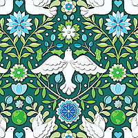 Doves are framed elegantly by verdant leaves growing symmetrically in this one way print. Stylized winter florals, holly, and planet Earths can be found amongst the curling vines. Larger birds are about 5", 'Damask' from the 'Peace On Earth - Winter' collection by Amanda Murphy for Benartex Fabrics.
