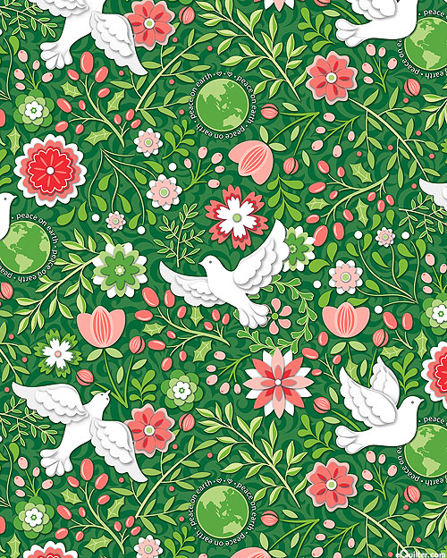 Doves, stylized winter flowers, sprigs, and little planet Earth's are all tossed atop this bright new Holiday fabric. The little planets have the phrase "peace on earth" encircling them. Larger birds are about 5", 'Feature' from the 'Peace On Earth - Holiday' collection by Amanda Murphy for Benartex Fabrics.