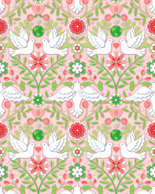 Doves are framed elegantly by verdant leaves growing symmetrically in this one way print. Stylized winter florals, holly, and planet Earths can be found amongst the curling vines. Larger birds are about 5", 'Damask' from the 'Peace On Earth - Holiday' collection by Amanda Murphy for Benartex Fabrics.