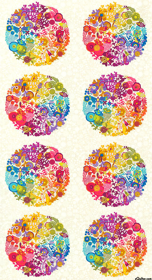Flowers and moths swirl about in a rainbow of electric color inhabiting secret garden worlds. Sculpted like topiaries, each of these floral balls rest on a bed of tonal foliage filling this panel with imagination and splendid artistic design. 24" panel, circles are about 10", from the 'Ex Libris' collection by Alison Glass for Andover Fabrics.