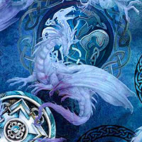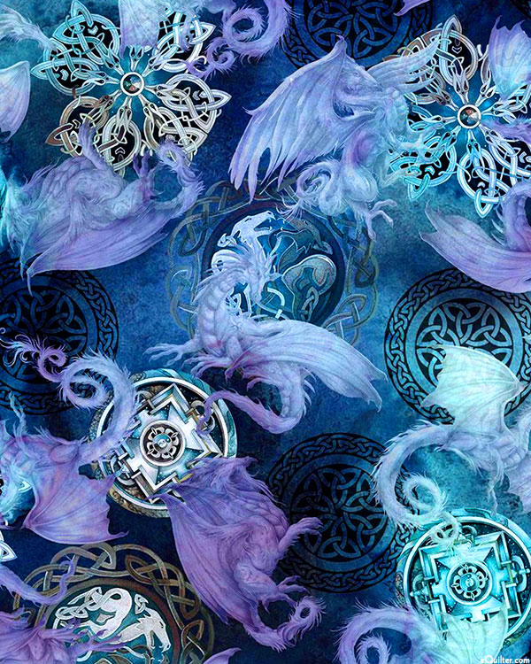 Majestic medallions woven into intricate Celtic knots are scattered across the design as the mighty forms of magical dragons fill the space between. Digitally printed, larger dragons are about 3", 'Night Sky Dragon' from the 'Mystic Dragon' collection by Jody Bergsma for Michael Miller Fabrics.