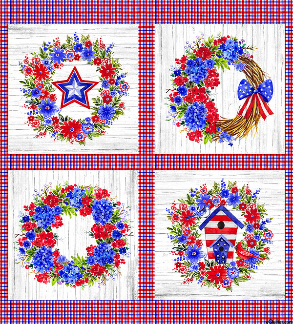 Framed within this patriotic panel are floral wreaths proudly decorated in red, white, and blue. Digitally printed, 36" panel, panel has four frames about 16" x 16", from the 'Independence Day' collection by Elena Vladykina for Robert Kaufman Fabrics.