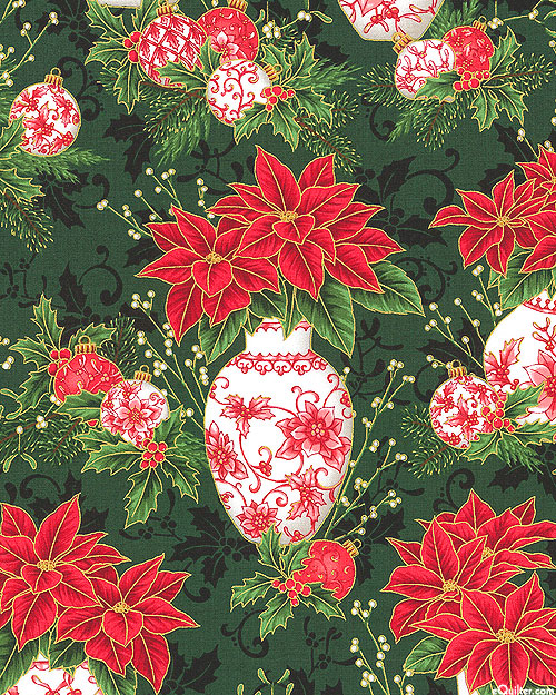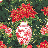 Elegant ceramic vases filled with poinsettias bring a festive flair to this Christmas-themed design. Larger vases with poinsettias are about 7-3/4", with gold metallic, from the 'Holiday Flourish - Festive Finery' collection by Studio RK for Robert Kaufman Fabrics.