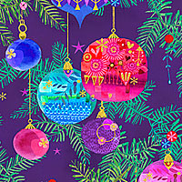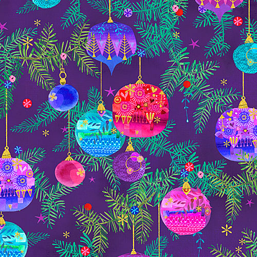 Unique and vibrant Christmas Tree ornaments hang from verdant green boughs and sparkle with glints of gold metallic. Larger Christmas ornaments are about 2", with gold metallic, from the 'Holy Night' collection by Lynn Horrabin for Robert Kaufman Fabrics.
