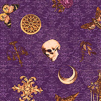 An ornate wallpaper-like repeat is covered in a variety of Halloween motifs including skulls, candelabras, insects, and spiderwebs. Digitally printed, skulls are about 1", from the 'Dreadful Delights' collection by Robert Kaufman Fabrics.
