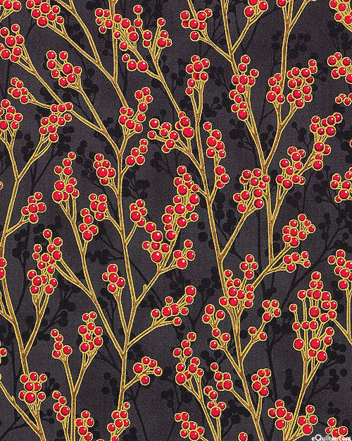 Kaufman Fabrics Festive Finery - Winter Berry Branches - Pepper Black/Gold